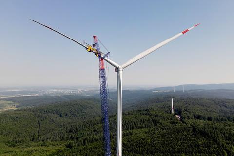 At the Schnürbuck wind farm near Ettenheim in Germany’s Black Forest, a repowering project is seeing six old turbines replaced with three Enercon E-160 EP5 E3 units. Specialist under-the-jib equipment from ematec is being used to overcome the site’s demanding forested terrain.